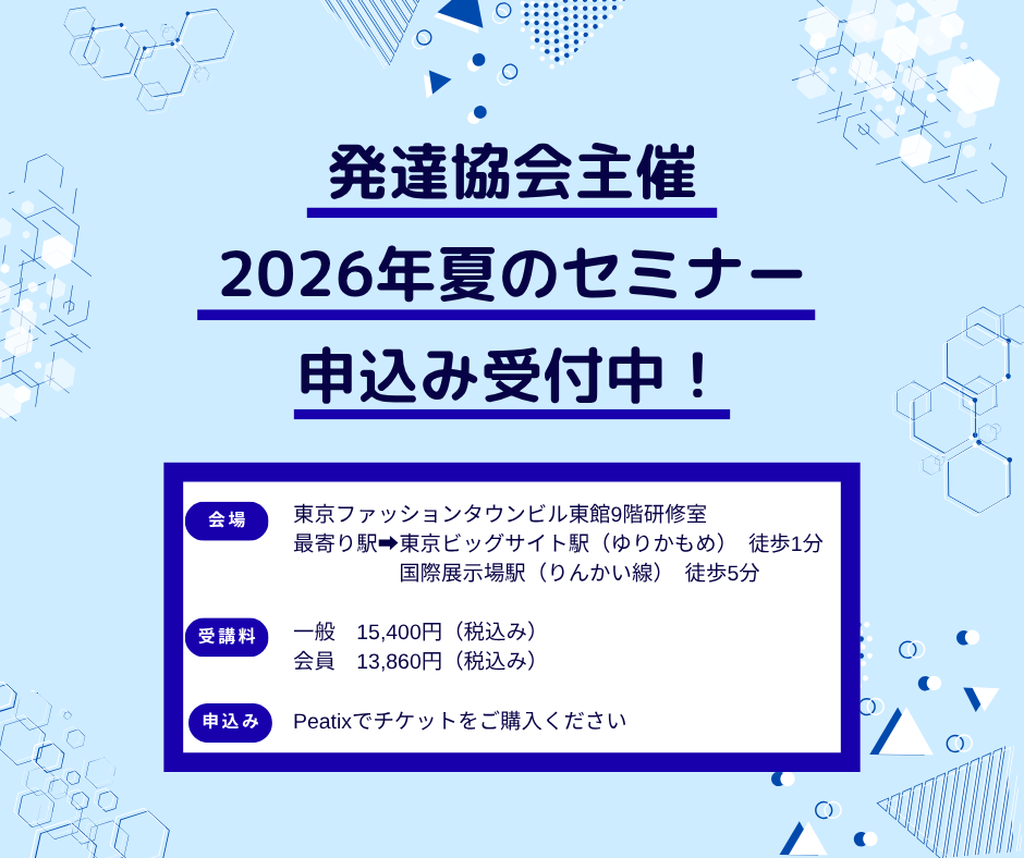 2026年度のセミナー情報をアップしました 2026.04.03 お知らせ 研修・出版 #発達障害 #研修 #知的障害 夏のセミナー、秋のセミナーともに8つのテーマで開催します。夏は2日かけてじっくりと、秋は1日完結で気軽に学ぶことができます。ぜひご参加ください! « 採用情報を更新しました お知らせ一覧へ