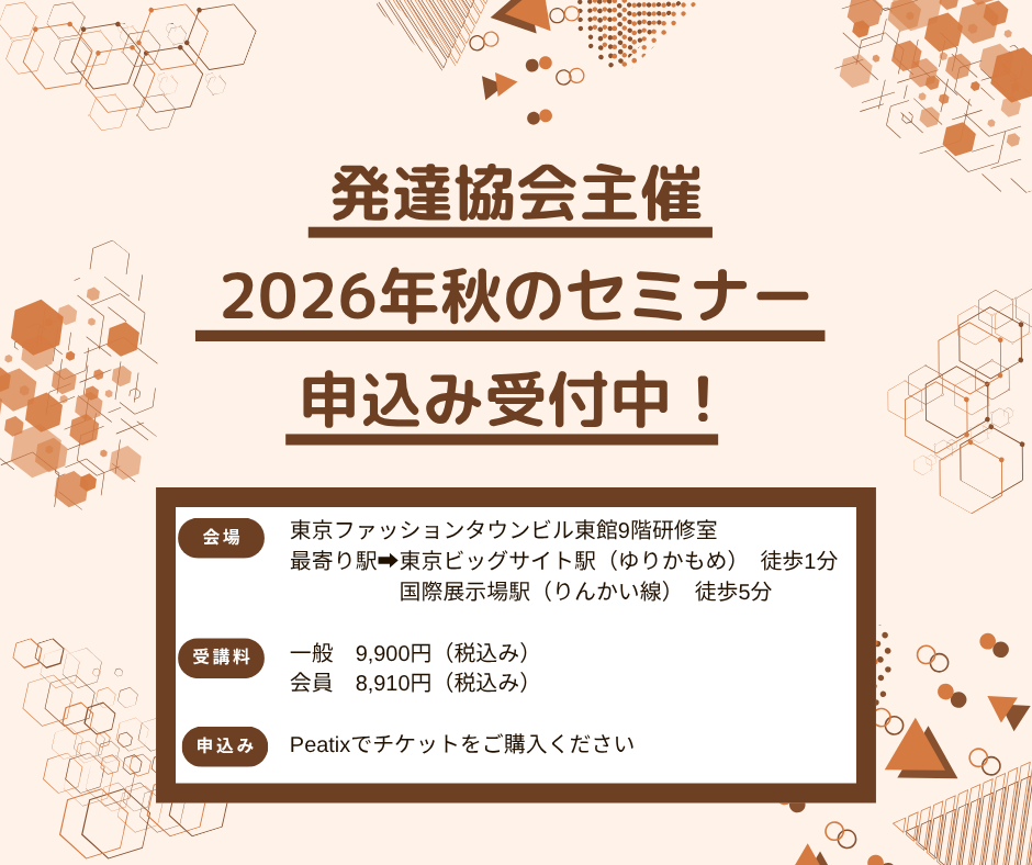2026年度のセミナー情報をアップしました 2026.04.03 お知らせ セミナー #発達障害 #研修 #知的障害 #対面研修 夏のセミナー、秋のセミナーともに8つのテーマで開催します。夏は2日かけてじっくりと、秋は1日完結で気軽に学ぶことができます。ぜひご参加ください! « 春のオンラインライブセミナーを開催しました お知らせ一覧へ